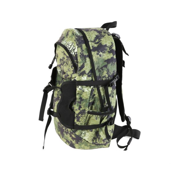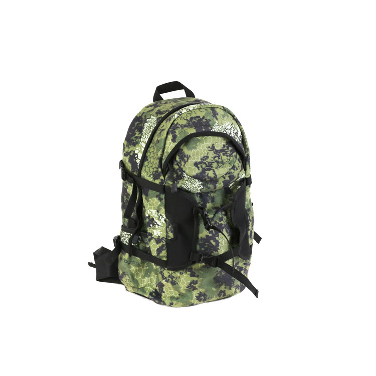 Camoflage pattern printing for maximum camouflage during deer turkey hunt Large front pocket with 2 side water bottle pockets for storage of camo netting ghillie suit and any other hunting accessories Adjustable padded shoulder straps for total comfort Chest belt for better fits